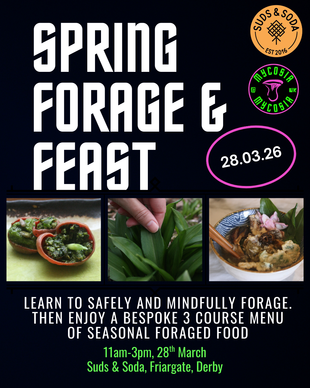 Join us for a foraging walk to harvest the delights of Spring - fresh green leaves, plant buds, and blossoms. Afterwards enjoy a bespoke three-course meal full of seasonal foraged food. Yum!
